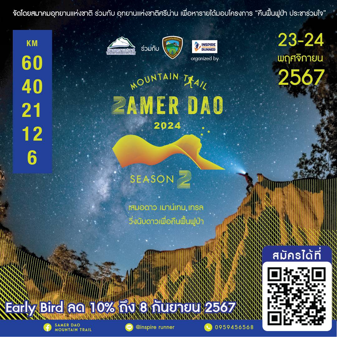 🏃🏃 Samer Dao Mountain Trail #2 “วิ่งนับดาว คืนฟื้นฟูป่า” กับสนาม Trail ตะลุยสายหมอกในป่าต้นน้ำน่าน โดยสมาคมอุทยานแห่งชาติ ร่วมกับอุทยานแห่งชาติศรีน่าน ณ ดอยเสมอดาว อุทยานแห่งชาติศรีน่าน จังหวัดน่าน ในวันที่ 23 – 24 พฤศจิกายน 2567