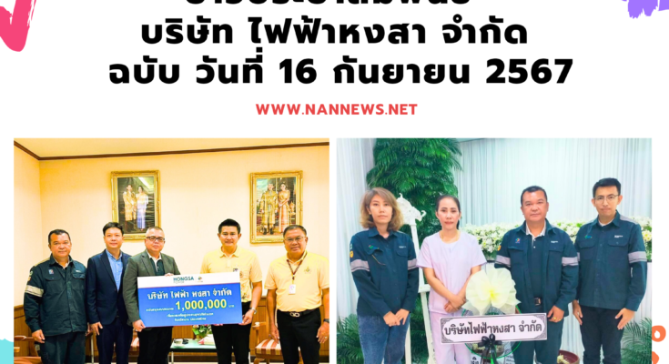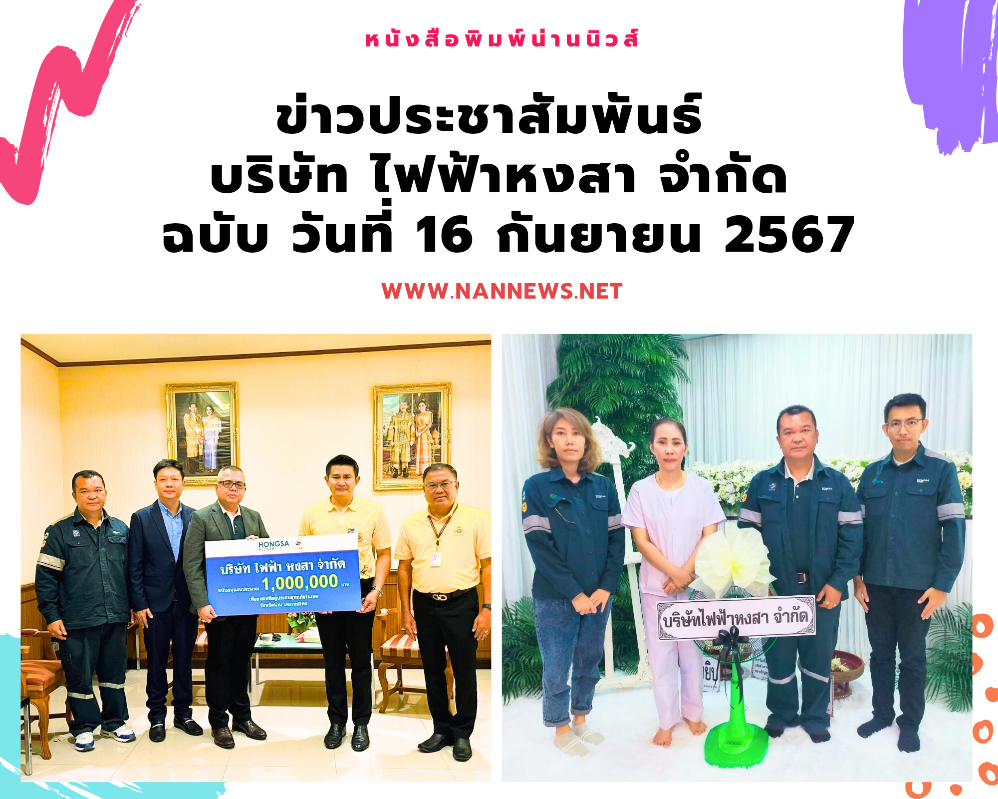 เมื่อวันที่ 2 กันยายน 2567 บริษัท ไฟฟ้า หงสา จำกัด นำโดย นายคทายุทธ์ ชูพูล กรรมการผู้จัดการ บริษัท ไฟฟ้า หงสา จำกัด พร้อมคณะ ได้มอบเงินสนับสนุนงบประมาณ จำนวน 1,000,000 บาท เพื่อให้ความช่วยเหลือแก่ผู้ประสบอุทกภัยจังหวัดน่าน
