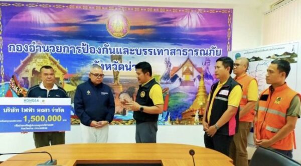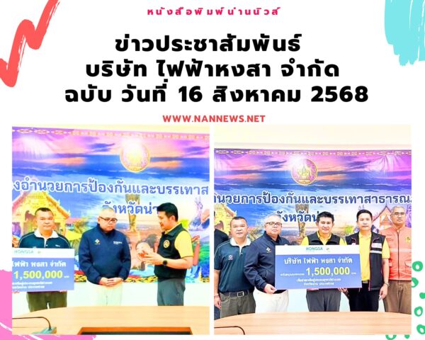 นายคทายุทธ์ ชูพูล กรรมการผู้จัดการ บริษัท ไฟฟ้า หงสา จำกัด มอบงบประมาณสนับสนุนจำนวน 1,500,000 บาท แก่จังหวัดน่าน เพื่อใช้ในภารกิจให้ความช่วยเหลือผู้ประสบอุทกภัยจากอิทธิพลของพายุโซนร้อน “วิภา” (WIPHA) ซึ่งส่งผลกระทบต่อพื้นที่ในช่วงวันที่ 22–24 กรกฎาคม ที่ผ่านมา พิธีมอบงบประมาณจัดขึ้น ณ ห้องประชุมสำนักงานป้องกันและบรรเทาสาธารณภัยจังหวัดน่าน