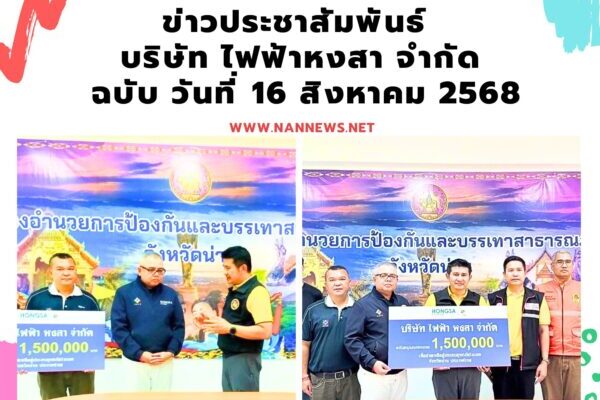 โดยมี นายชัยนรงค์ วงศ์ใหญ่ ผู้ว่าราชการจังหวัดน่าน เป็นผู้รับมอบ พร้อมด้วยหัวหน้าส่วนราชการ และผู้แทนจากสื่อมวลชนในพื้นที่ร่วมเป็นสักขีพยาน บริษัท ไฟฟ้า หงสา จำกัด ขอแสดงความห่วงใยต่อผู้ประสบภัยทุกท่าน และพร้อมร่วมเคียงข้างประชาชนในการฟื้นฟูและบรรเทาความเดือดร้อนด้วยความห่วงใยและตั้งใจจริง