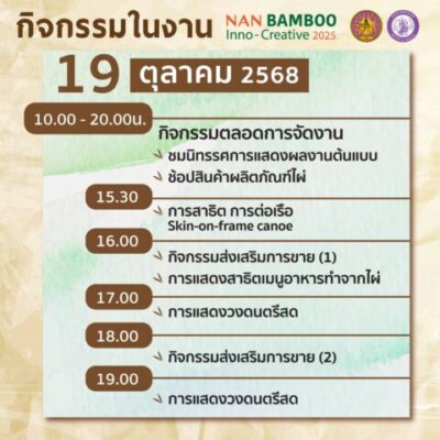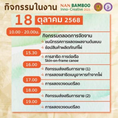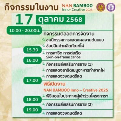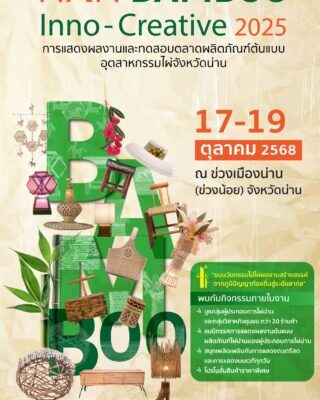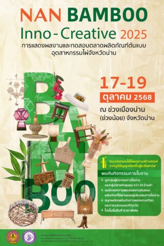 ขอเชิญร่วมสัมผัสภูมิปัญญาสู่ความคิดสร้างสรรค์ของผู้ประกอบการไผ่น่าน ในงานทดสอบตลาดผลิตภัณฑ์ต้นแบบอุตสาหกรรมไผ่จังหวัดน่าน NAN BAMBOO Inno-Creative 2025