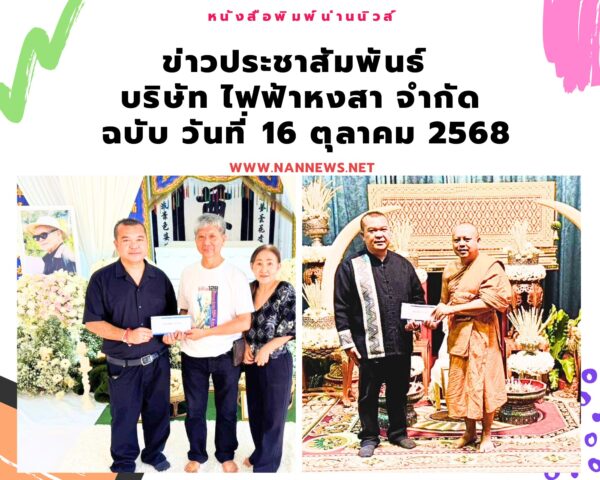เมื่อวันที่ 11 ตุลาคม 2568 บริษัท ไฟฟ้า หงสา จำกัด โดย นายมงคล แปงแก้ว เจ้าหน้าที่ฝ่ายองค์กรสัมพันธ์ สำนักงานน่าน เข้าร่วมงานพิธีเปิดแพรคลุมป้าย อาคารสำนักงาน สมาคมสว่างนครน่านรวมใจ (หน่วยกู้ภัยสว่างนครน่านรวมใจ) ณ อาคารเลขที่ 101 ถนนเจ้าฟ้า ตำบลในเวียง อำเภอเมืองน่าน จังหวัดน่าน